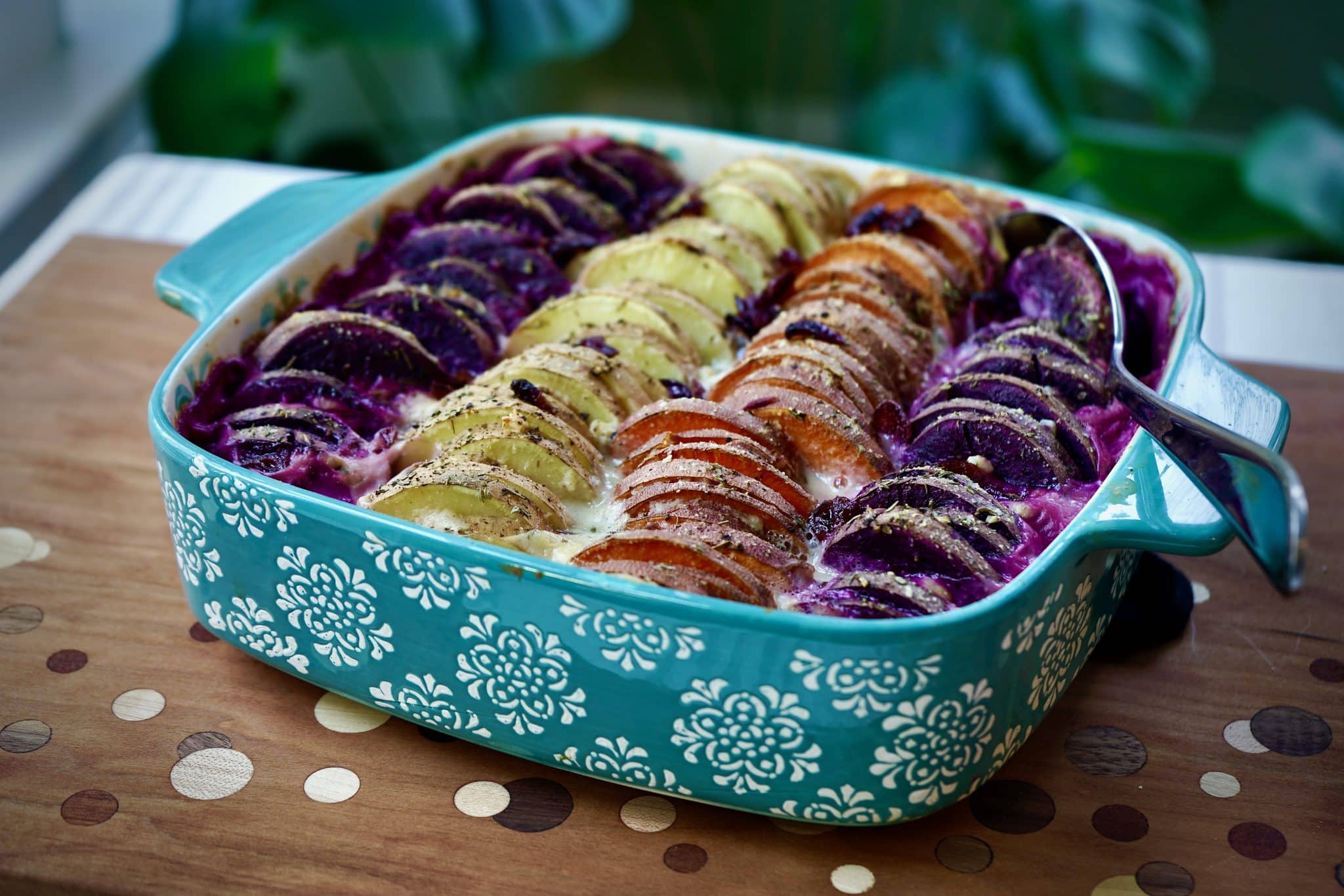 Your family and friends will be amazed this holiday season when you serve up this Healthy Plant-Based Sweet Potato Gratin! A feast for the eyes and taste buds, this rich and indulgent recipe is as healthy as it is delicious. The rows of bite sized multicolored sweet potatoes baked to perfection in this creamy sauce are sure to satisfy. They won't believe something this tasty can be good for you!